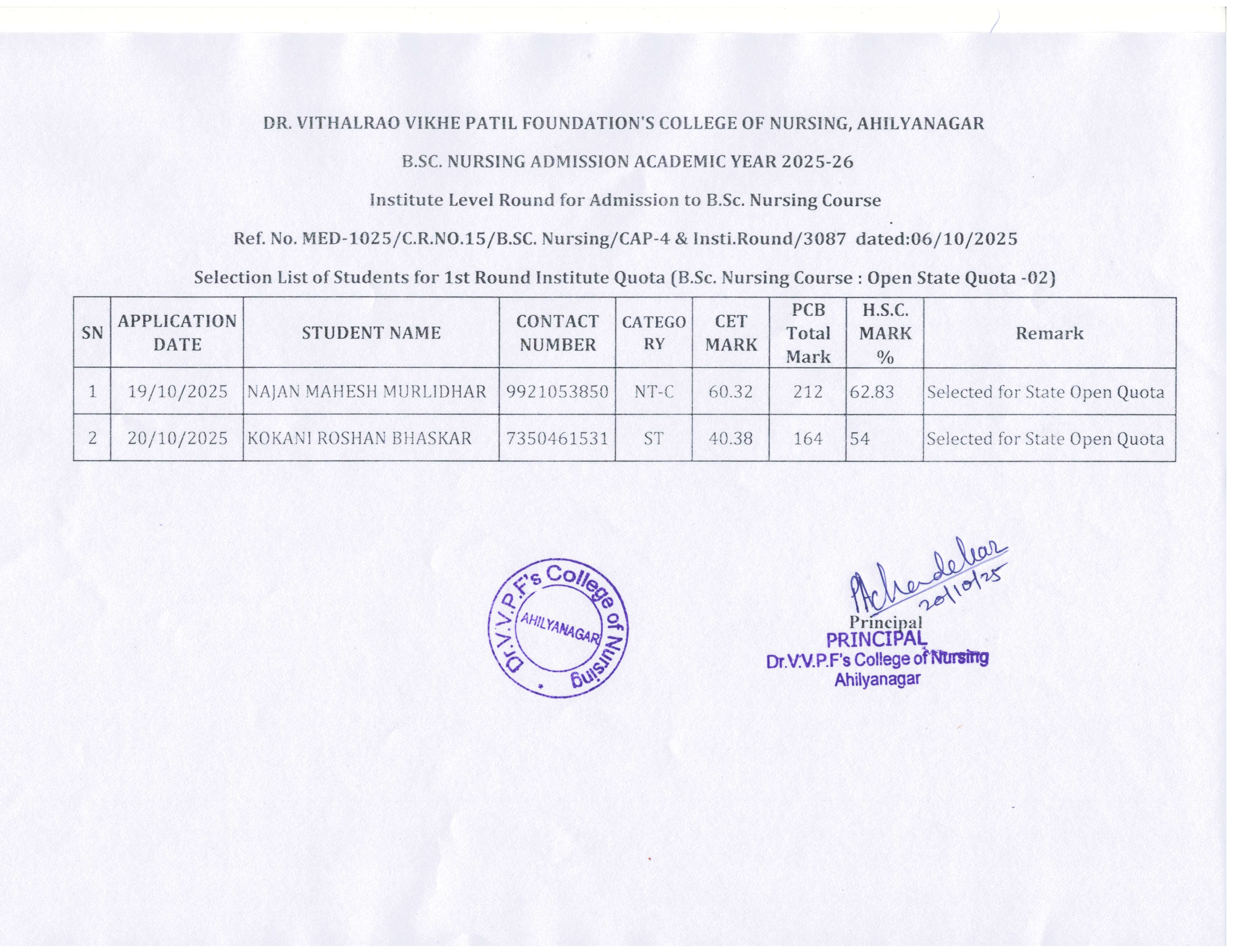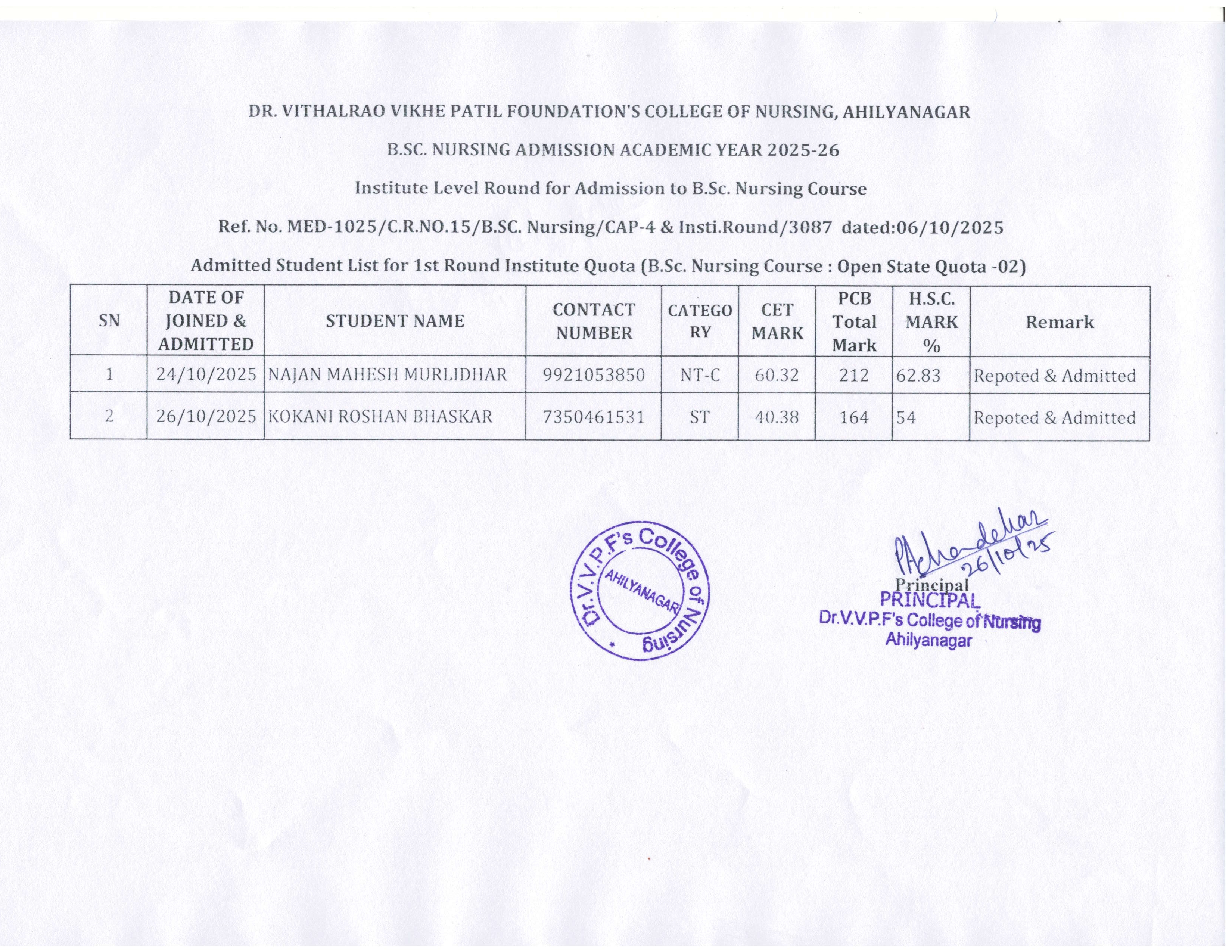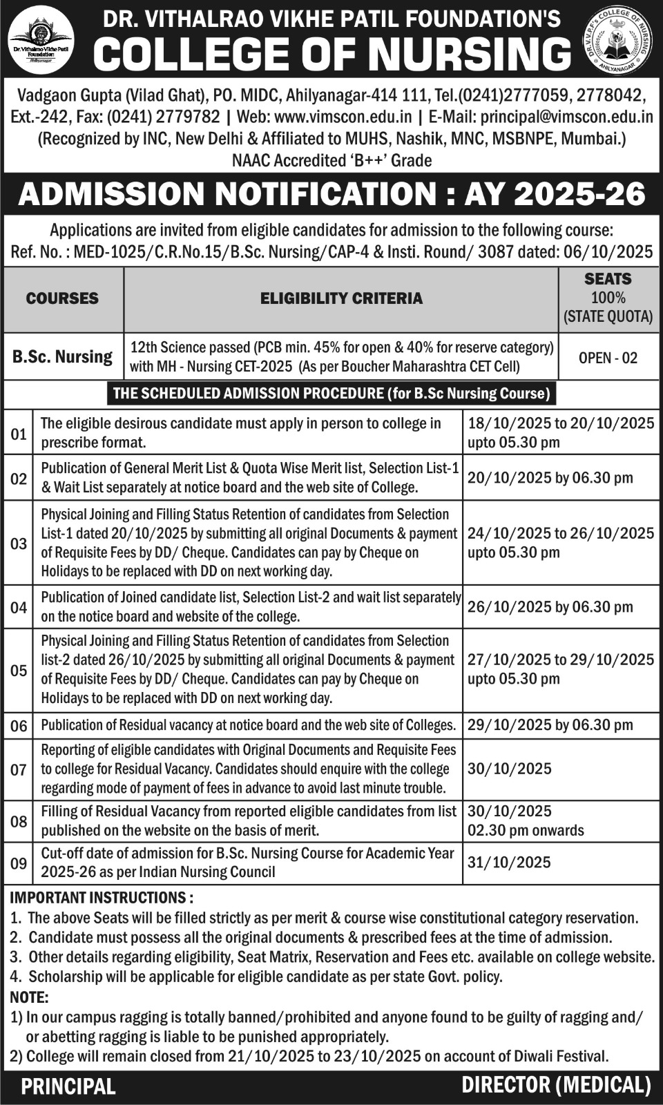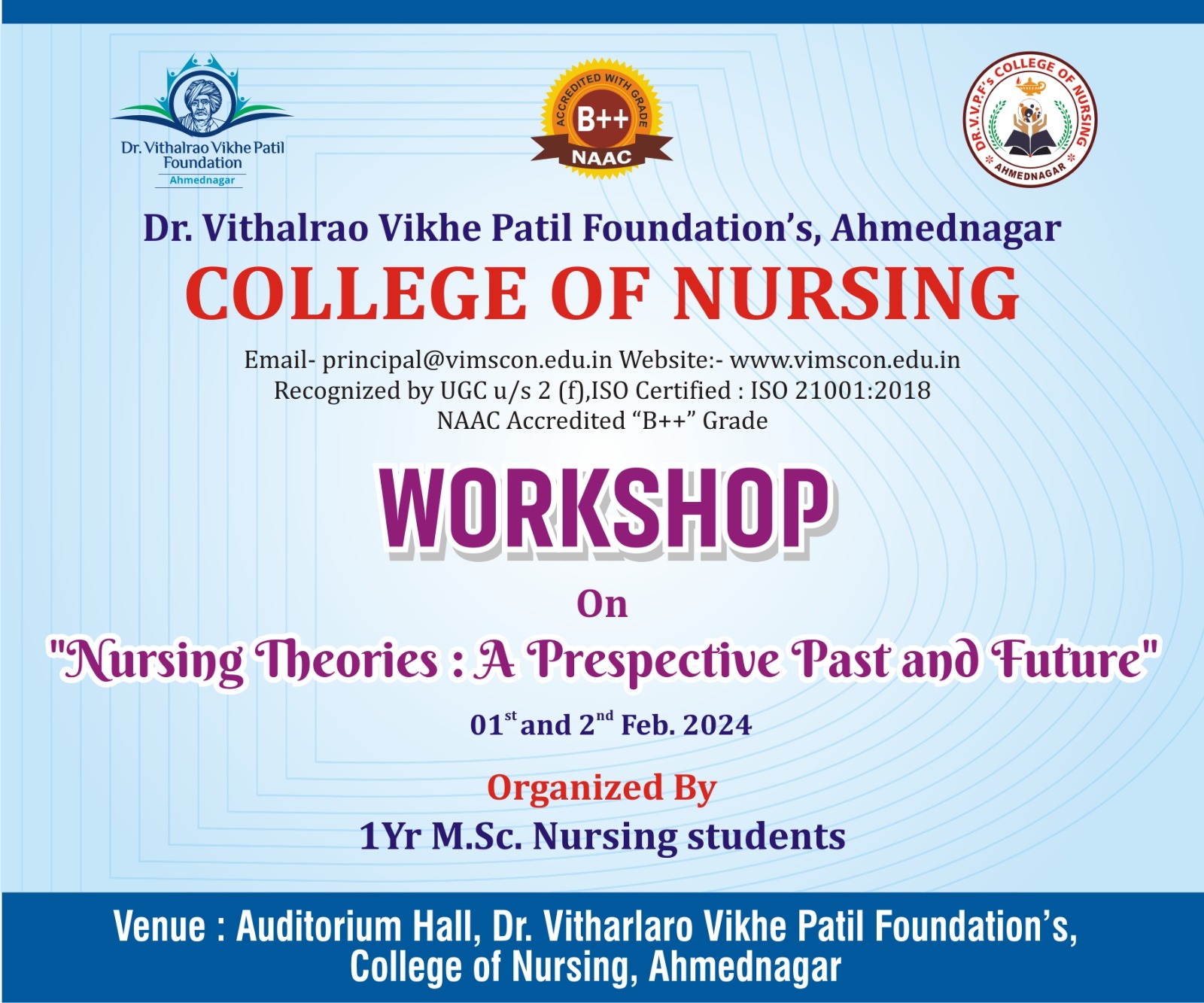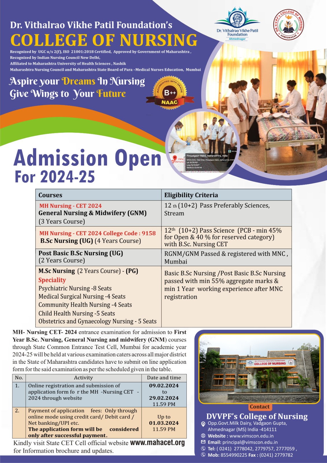 Dr. Vithalrao Vikhe Patil Foundation’s, College of Nursing, Ahilyanagar, is recognized by Government of Maharashtra, Maharashtra Nursing Council, Mumbai and Indian Nursing Council, New Delhi.