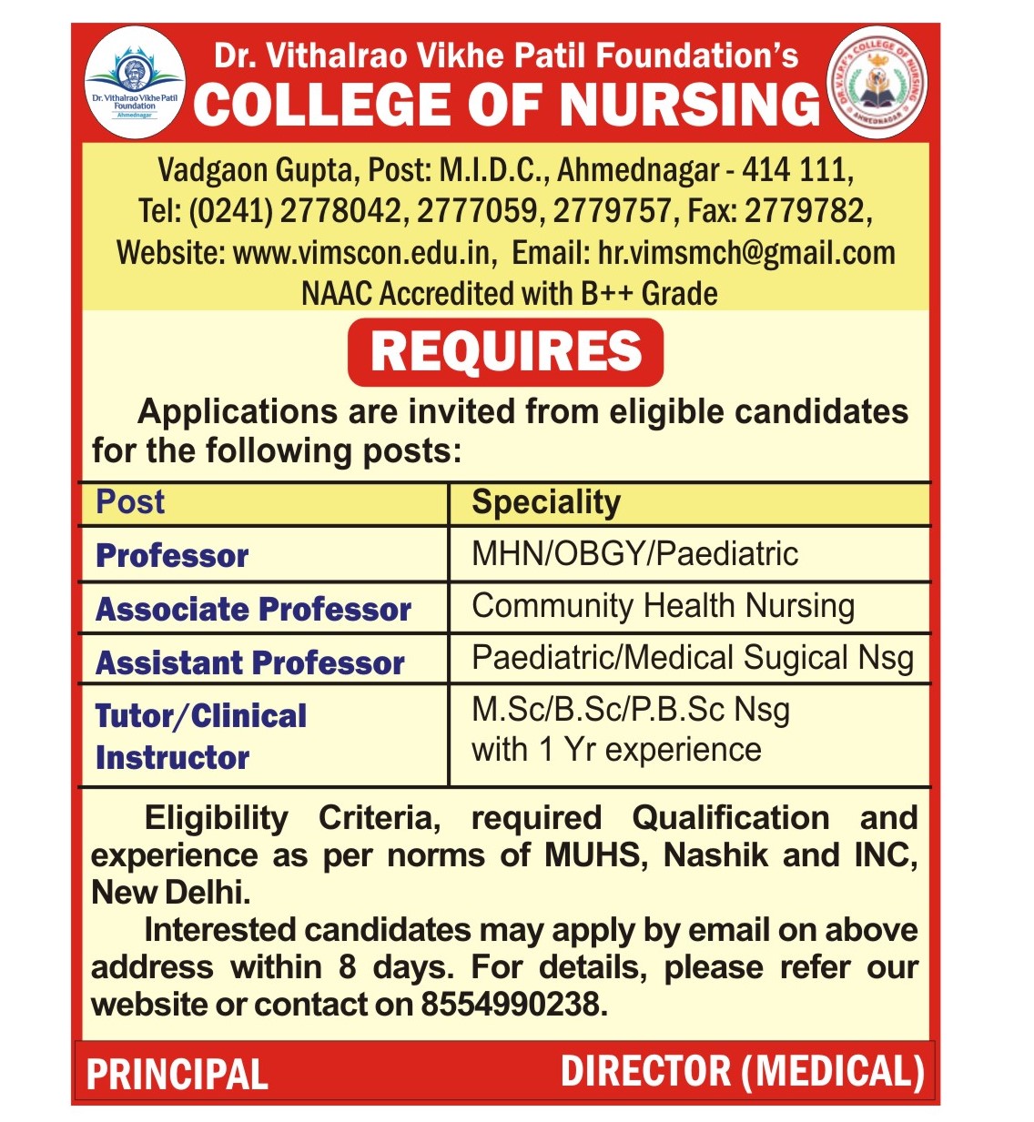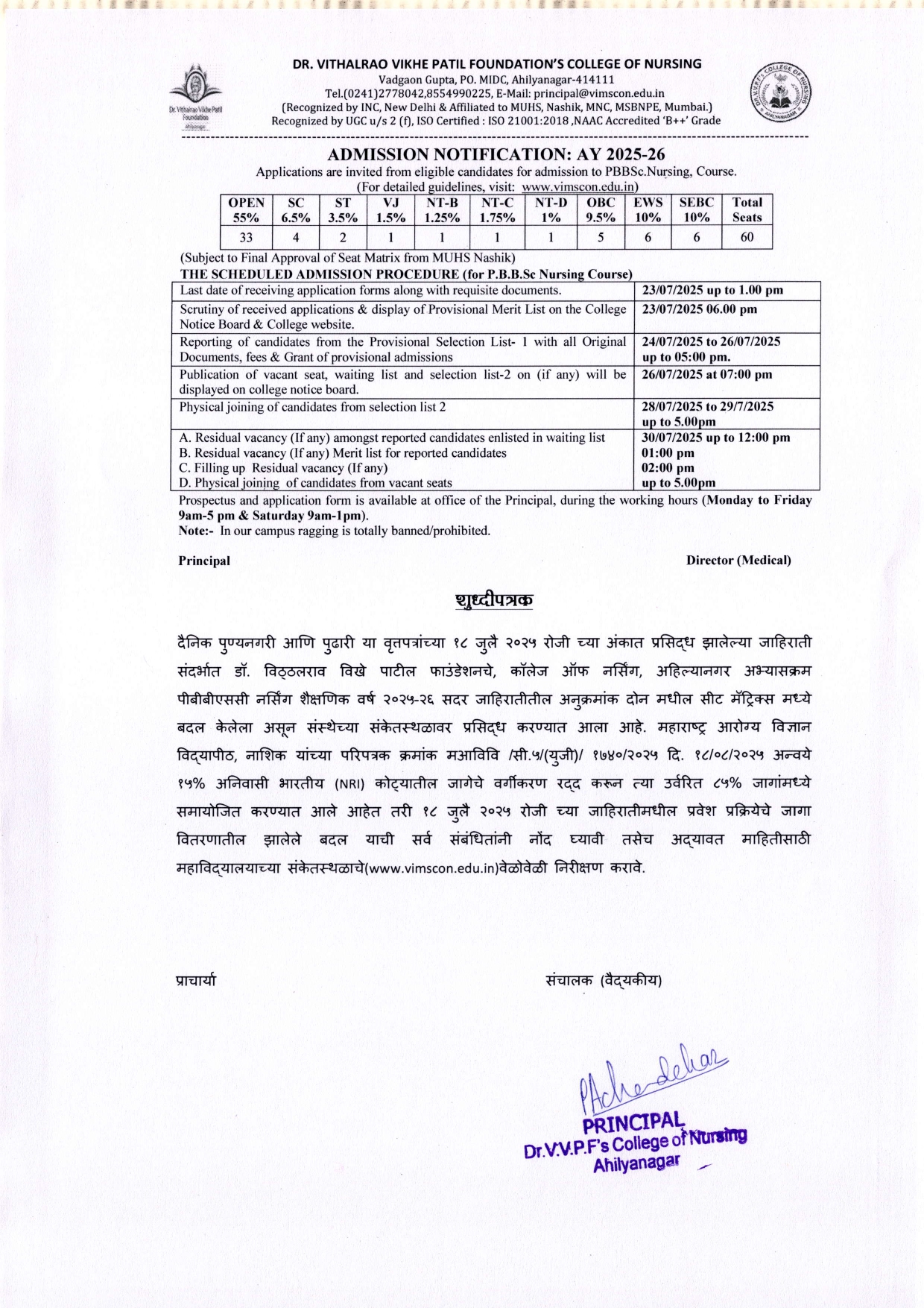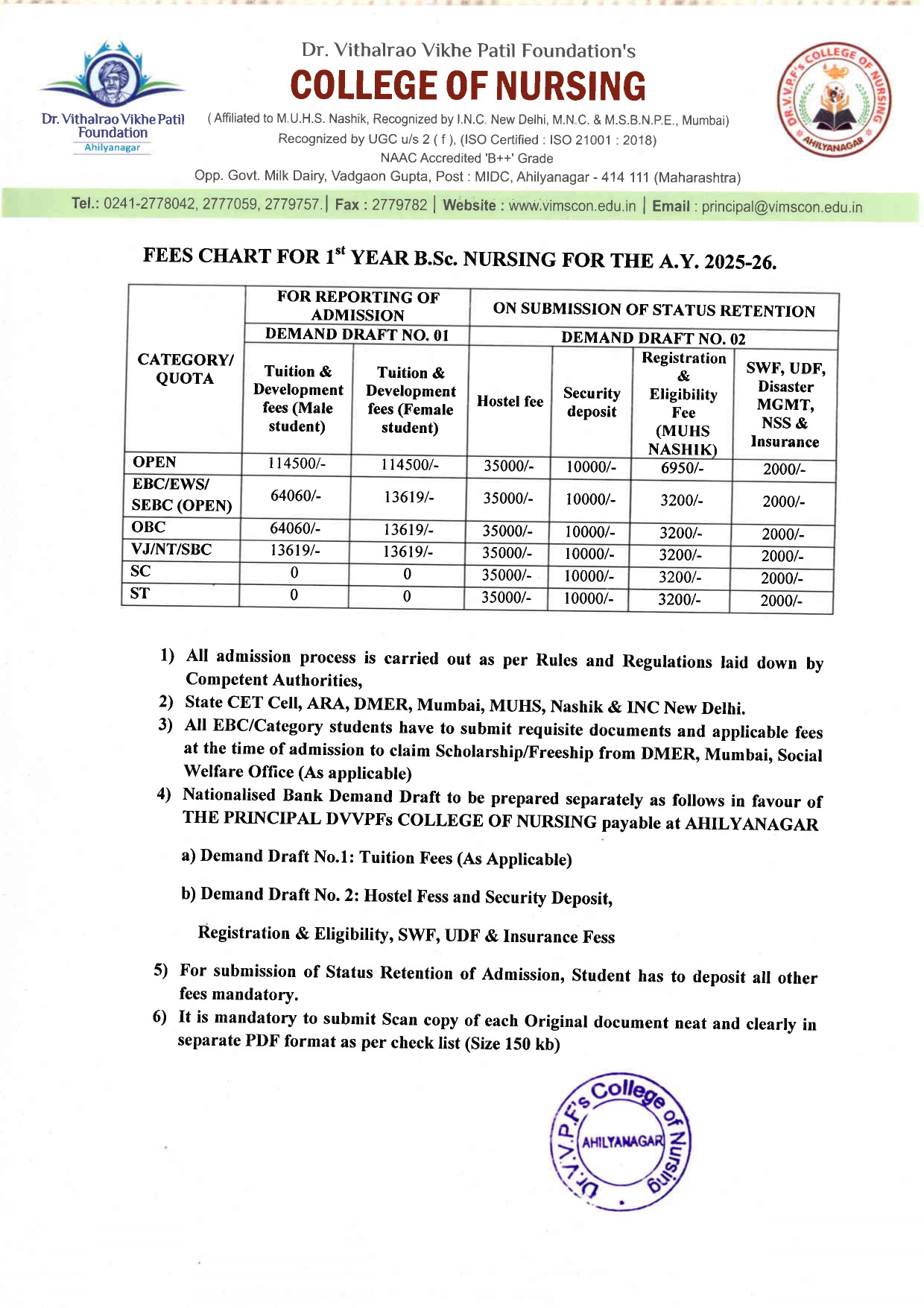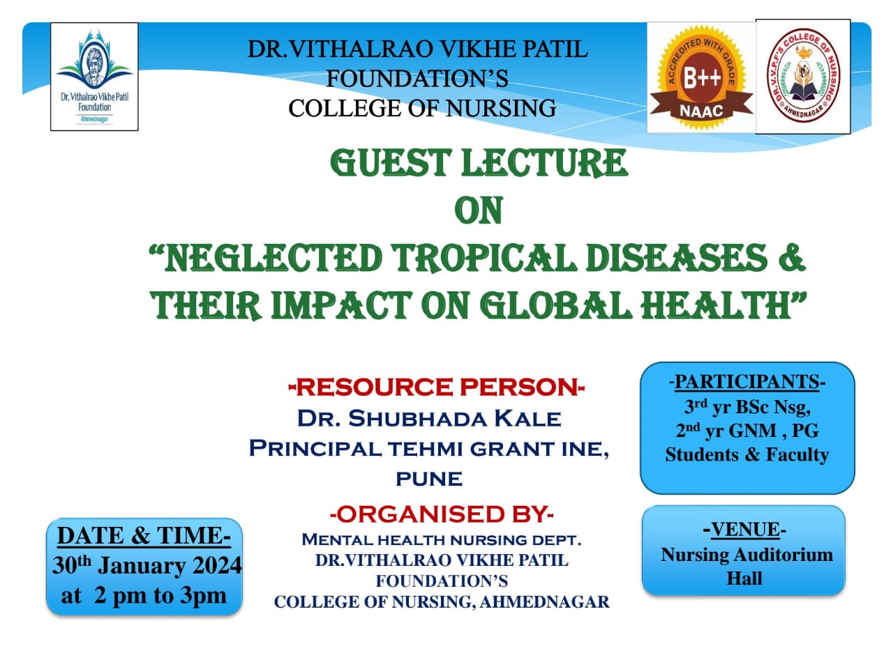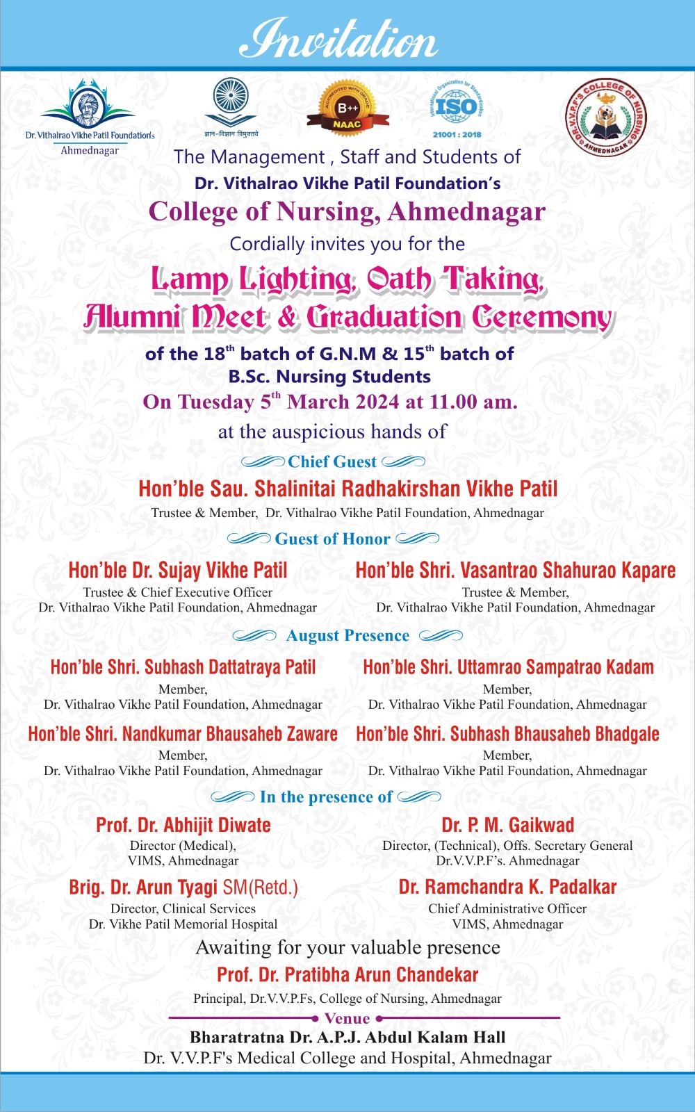 Dr. Vithalrao Vikhe Patil Foundation’s, College of Nursing, Ahilyanagar, is recognized by Government of Maharashtra, Maharashtra Nursing Council, Mumbai and Indian Nursing Council, New Delhi.